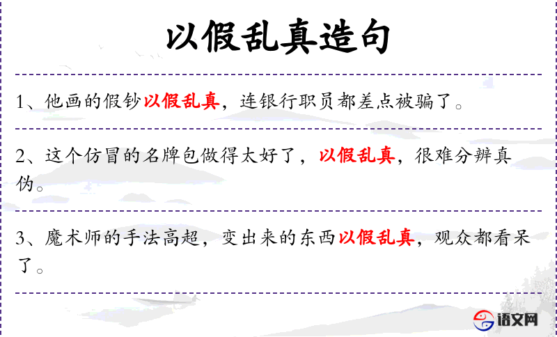 1. 【以假乱真】 以:用;乱:混乱。用假的东西去冒充或混杂真的东西。