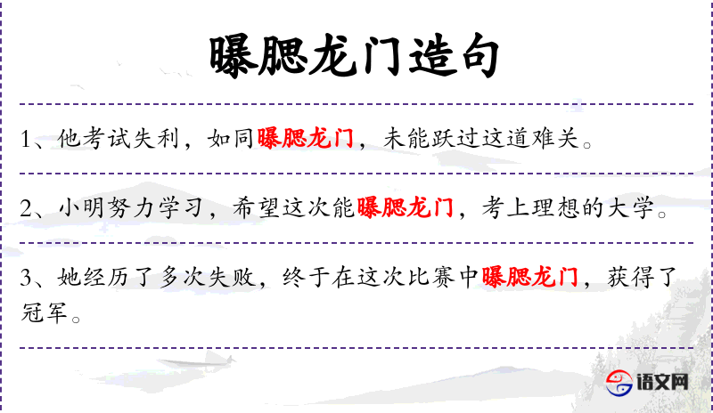 3. 【曝腮龙门】 曝:晒;龙门:河津。鲤鱼在龙门下晒它的两腮。比喻科举落榜。