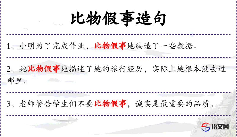 1. 【比物假事】 - 假借相类的事物,相进行比较归纳。