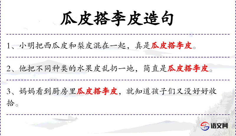 3. 【瓜皮搭李皮】 搭:连接上,挂上。瓜皮挂在李子树皮上。比喻和毫无关系的人强认亲族。