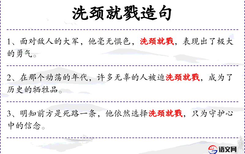 8. 【洗颈就戮】 - 把脖子洗净,伸到刀下受斩。比喻等待灭亡。