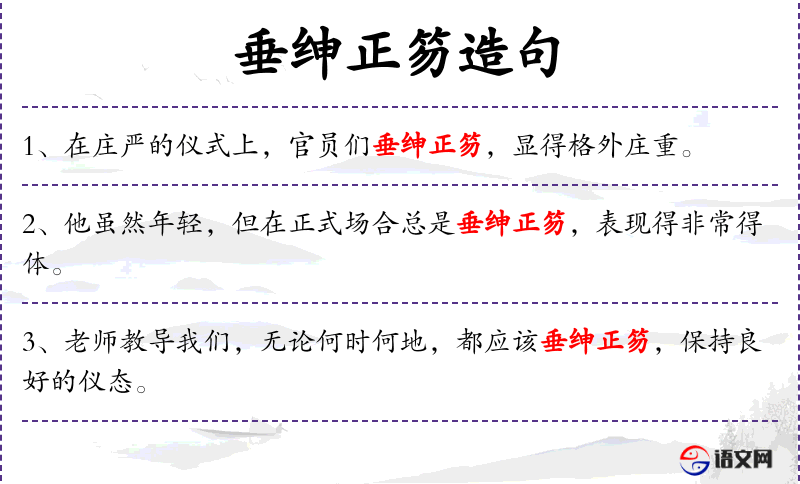 - 日文翻译中,“紳帯を垂らし”和“笏を正しく持ち”也准确表达了原句的意思。
