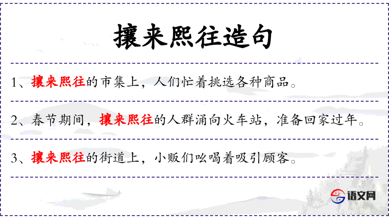 - 攘来熙往:形容人多热闹,来来往往。