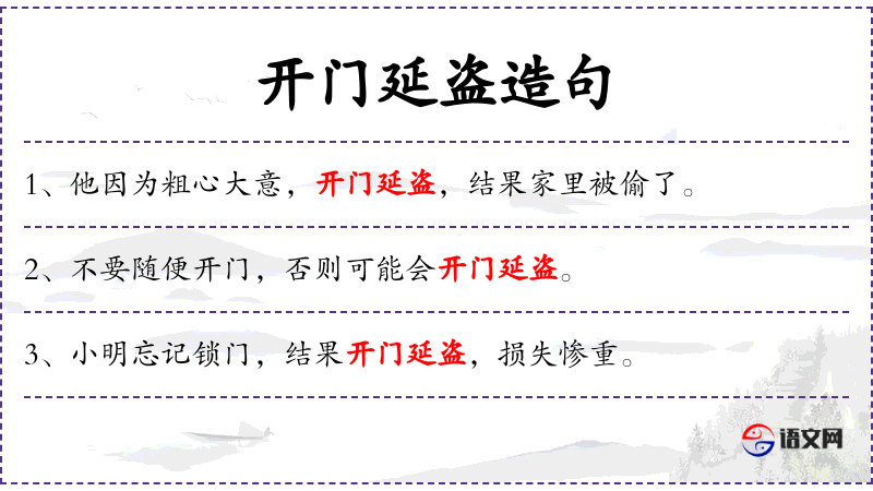 - 开门:动宾短语,表示将门打开。 *. 延盗:动宾短语,表示因为门未锁而导致的盗窃行为。