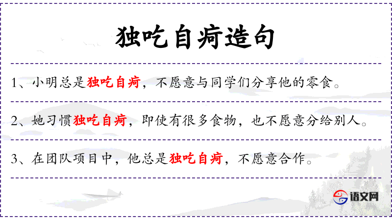 1. 【独吃自疴】 - 疴:即“屙”,拉屎撒尿。比喻顾己不顾人,一人独吞。
