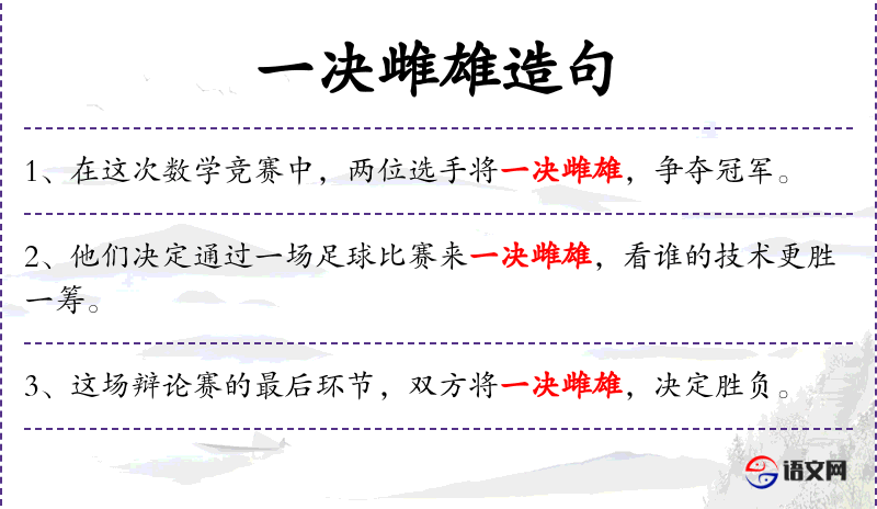 - 成语:“一决雌雄”源自古代战争,表示通过战斗来决定胜负,后引申为各种竞争场合。