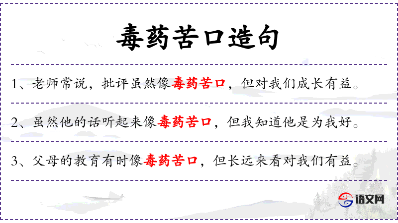5. 【毒药苦口】 - 毒药:攻毒的药物。比喻尖锐的批评虽然像毒药一样苦口难服,却能让人醒悟。