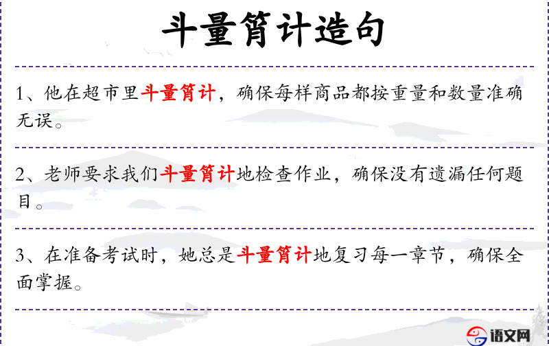 - 斗量筲计:成语,形容非常仔细地计算或衡量。