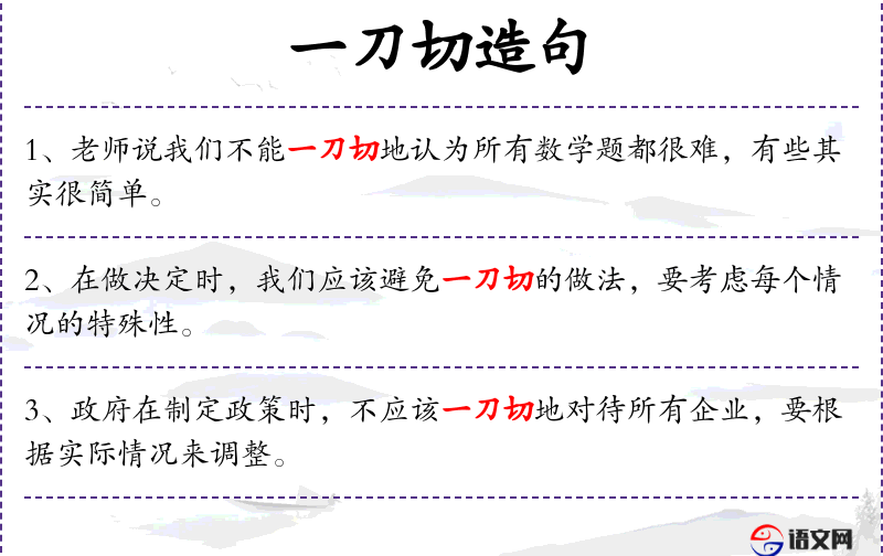 - 一刀切:指不考虑具体情况,采取统一的处理方式。