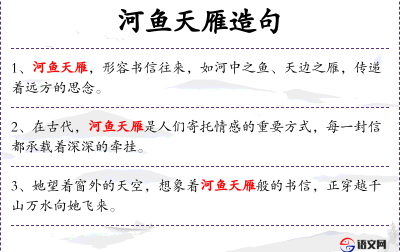 2. 【河鱼天雁】 - 古传鱼雁都能传递书信,后即以之借指传送书信者。