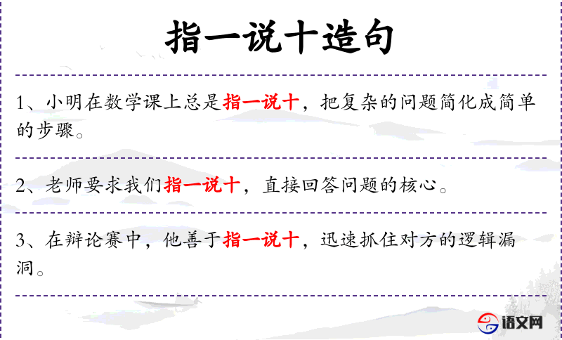- 指一说十:这个成语源自**传统文化,强调说话的简洁和效率。