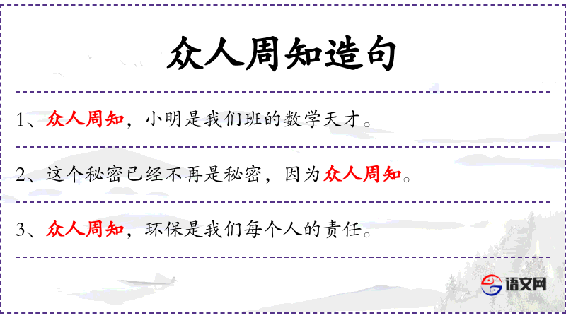 1. 【众人周知】 周:普遍。大家普遍知道的。