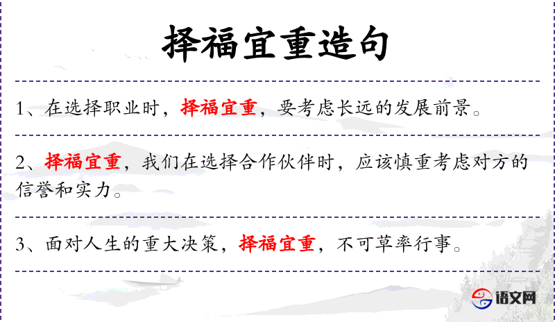 - 择福宜重:这是一个成语,意思是选择福祉时要慎重,引申为在做重要选择时要谨慎。