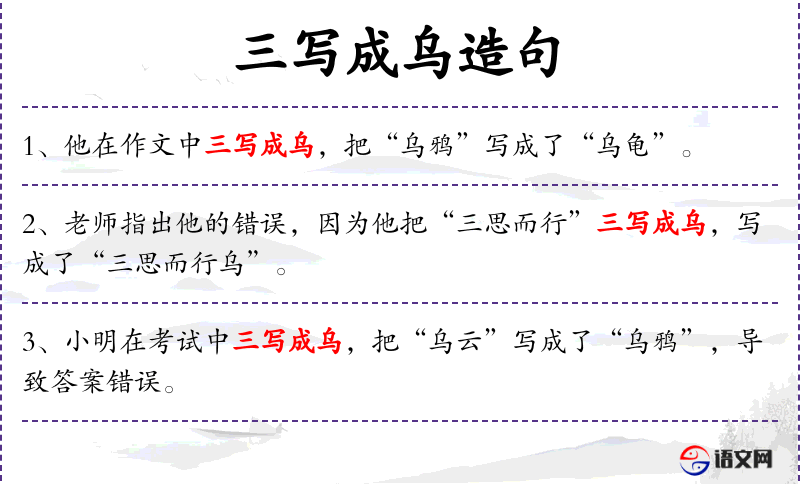 句子中的“三写成乌”是一个具体的书写错误,可能涉及到汉字书写的规范和文化背景。在**文化中,汉字书写的准确性一直被重视,这种错误在正式文稿中是不被接受的。