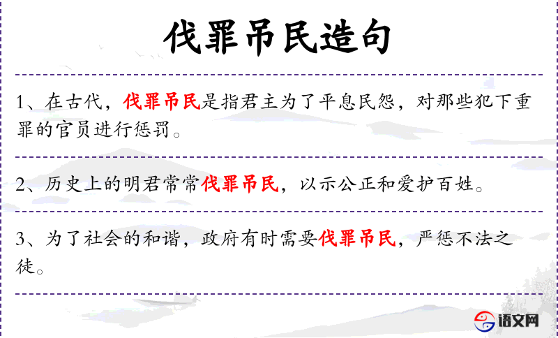 - 伐罪吊民:这个短语的意思是对犯罪者进行惩罚,同时安抚民众。