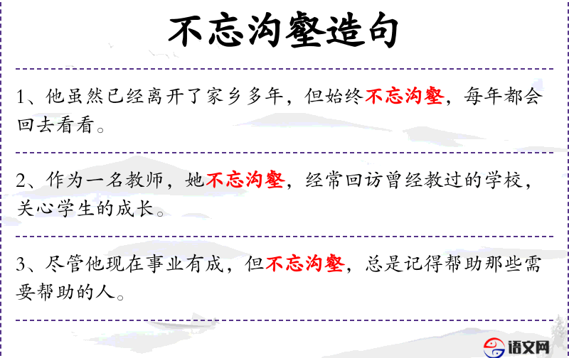 句子:“作为一名教师,她不忘沟壑,经常回访曾经教过的学校,关心学生的成长。”