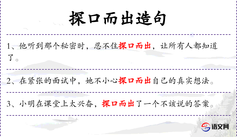- 成语典故:“探口而出”类似于成语“脱口而出”,形容说话不经思考。