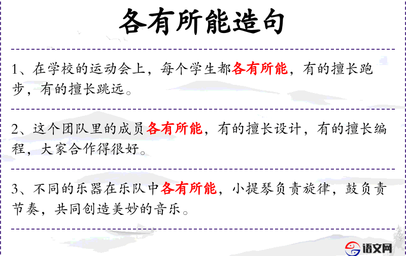 - 谓语:各有所能、擅长、有