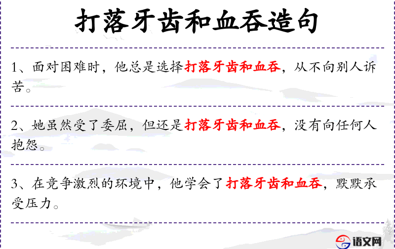 - “打落牙齿和血吞”是一个**成语,源自古代武士的忍耐精神,强调在困境中保持尊严和坚韧。