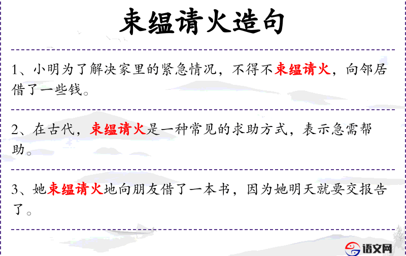 3. 【束缊请火】 - 束缊:束一扎可烧的大麻为火把;请火:借火。搓麻为引火绳,向邻家讨火。比喻求助于人。也比喻为人排难解纷。