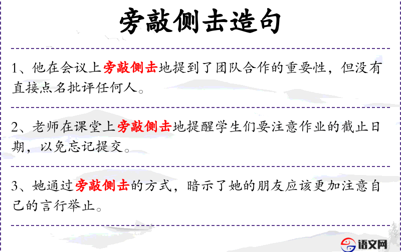 - 旁敲侧击:间接地、不直接地提醒或暗示。