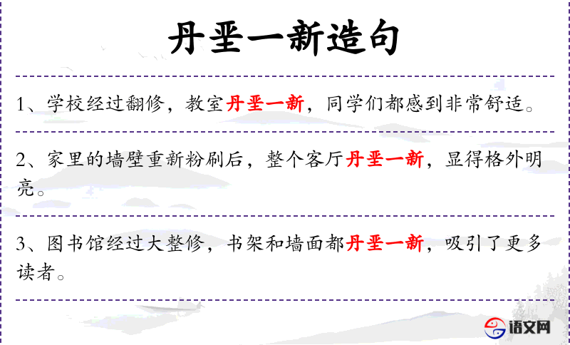 “丹垩一新”这个成语源自**古代,形容经过粉刷或装修后焕然一新。这个成语的使用体现了中文表达中对形象和色彩的重视。