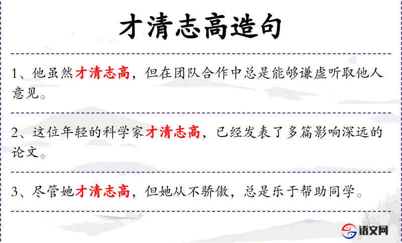 - 才清志高:形容一个人有很高的志向和清高的品质。