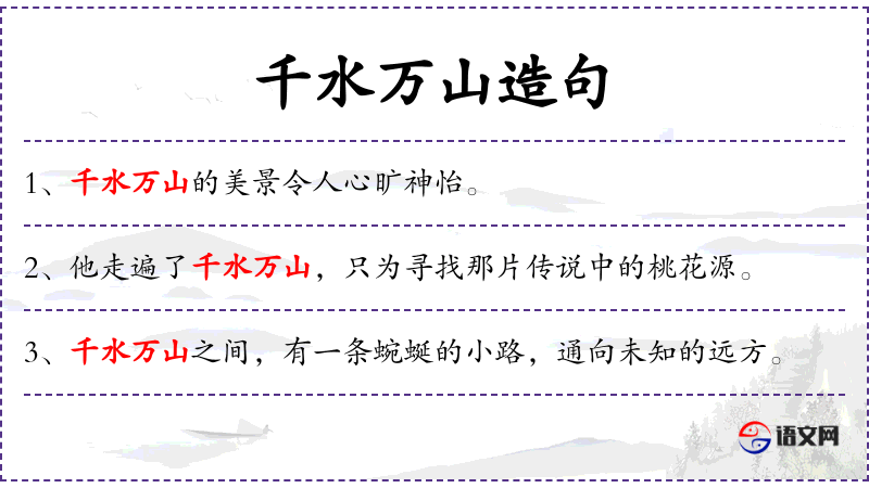 - 千水万山:形容自然景观的广阔和多样,常用来比喻自然风光的壮丽。