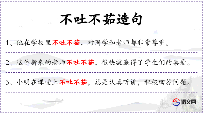 - 不吐不茹:这是一个成语,形容说话做事得体,既不粗鲁也不过分谦卑。