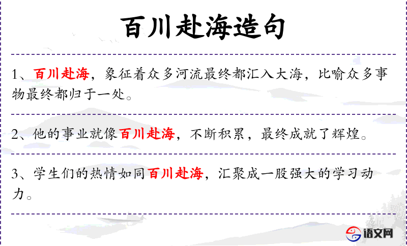 5. 【百川赴海】 百:表示多。川:江河。所有江河都流归大海。比喻众望所归或大势所趋。也比喻许多事物由分散而汇集到一处。