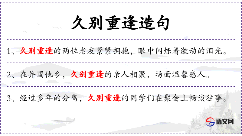 1. 【久别重逢】 指朋友或亲人在长久分别之后再次见面。