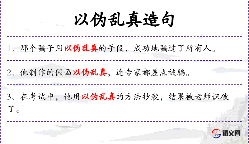 - 宾语:无明确宾语,但“以伪乱真”作为谓语的补足语