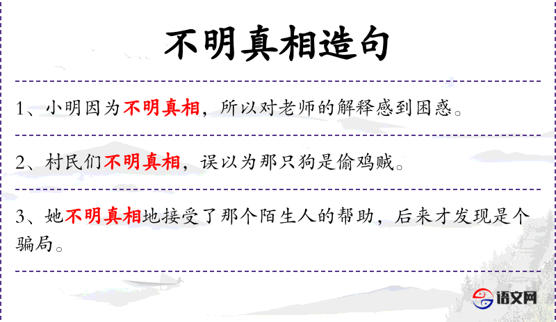 1. 【不明真相】 明:明白;真相:事情的实际情况。不明白事情的实际情况。