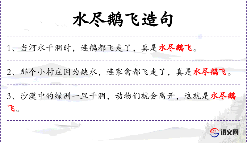 2. 【水尽鹅飞】 - 水干涸,鹅飞走。比喻恩情断绝,各走各的路。也比喻精光,一点儿也不剩。