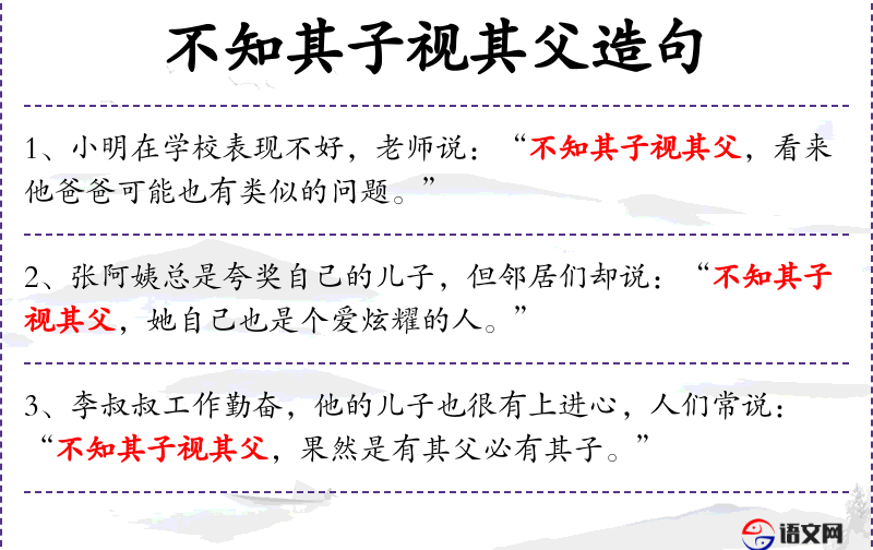 - 不知其子视其父:成语,意为不了解自己的孩子,却去评价别人的父亲。