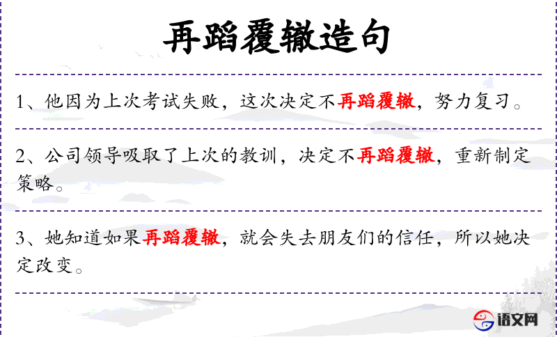 - 再蹈覆辙:这个成语在**文化中常用,强调避免重复错误的重要性。