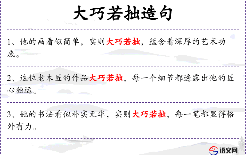- 宾语:“朴实无华”、“大巧若拙”、“格外有力”