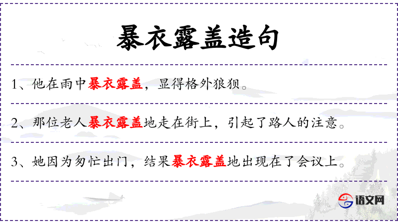 1. 【暴衣露盖】 - 日晒衣裳,露湿车盖。形容奔波劳碌。暴,晒。
