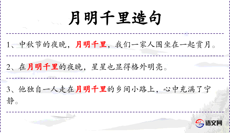 2. 【月明千里】 - 月光普照大地。后多用作友人或恋人相隔遥远,月夜倍增思念的典故。