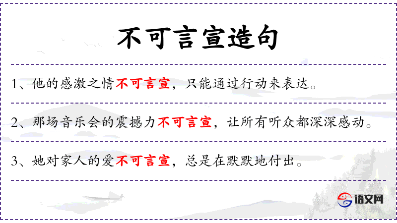 1. 【不可言宣】 言:言语;宣:发表,表达。指不是言语所能表达的(用在说事物的奥妙、味道)。