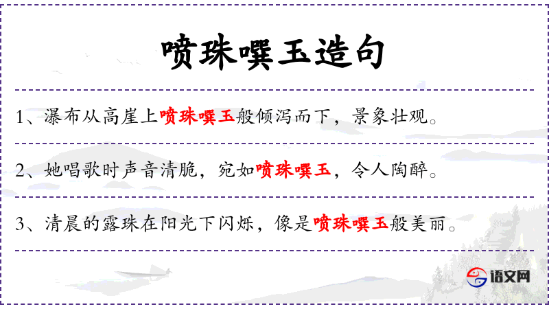 句子:“清晨的露珠在阳光下闪烁,像是喷珠噀玉般美丽。”