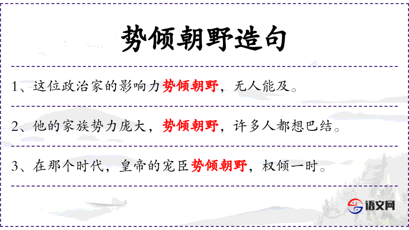 - 势倾朝野:这个成语源自**古代,形容一个人的权力或影响力极大,可以影响到朝廷的决策。