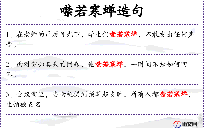 - 文化意义:“噤若寒蝉”这个成语反映了**文化中对权威的尊重和对责任的重视。