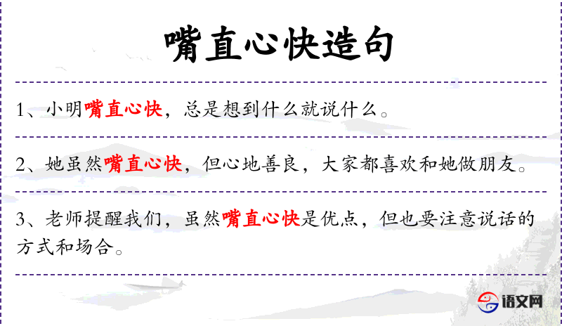 - 嘴直心快:形容说话直率,心意表达迅速。
