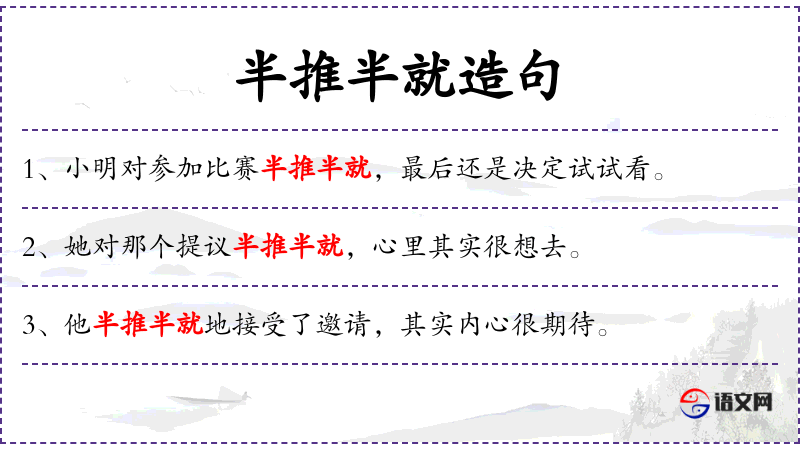 - 半推半就:成语,表示既不愿意又不太抗拒,最终还是接受了。