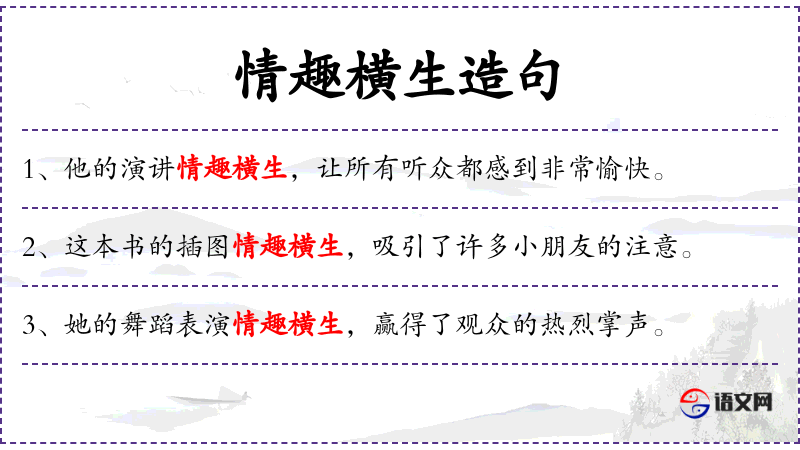 - 情趣横生:妙趣横生、趣味盎然