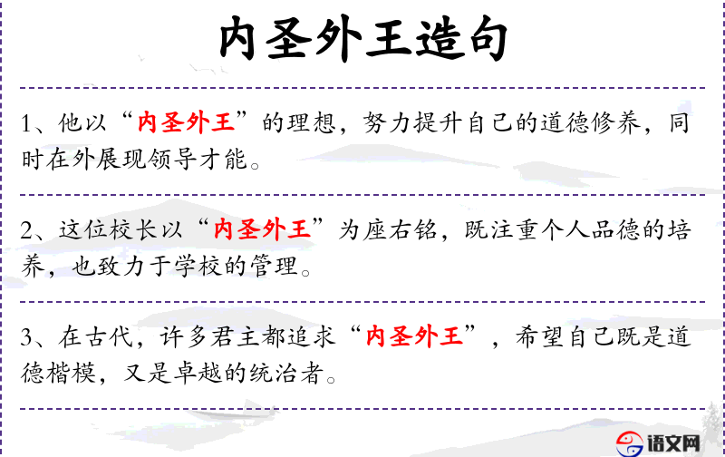 - 内圣外王:成语,指内心修养达到圣人的境界,外在表现如同王者般威严。