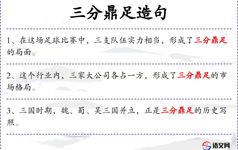 1. 【三分鼎足】 - 鼎:古代炊具,三足两耳。比喻三方分立,互相抗衡。