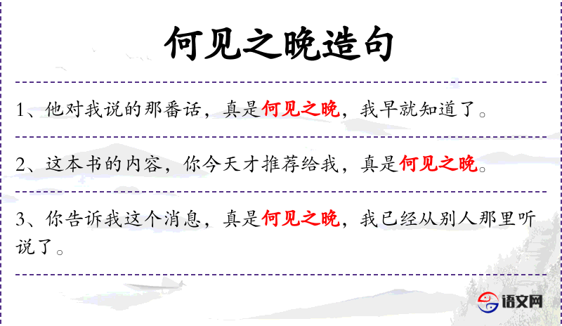 - 何见之晚:成语,意为“为什么这么晚才看到”,表达对某人迟到的失望或不满。