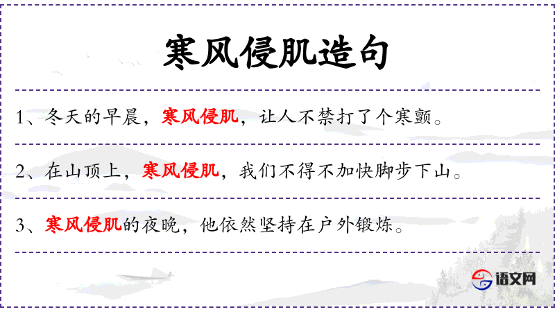 - 定语:“寒风侵肌的冬日”(修饰“冬日”)